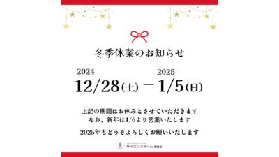 誠に勝手ながら、以下の期間を冬季休業とさせていただきます。