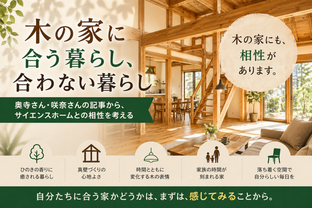 木の家に合う暮らし、合わない暮らし 【奥寺さん・咲奈さんの記事から、サイエンスホームとの相性を考える】 こんにちは。 エルハウス/LHOUSE CEOの網倉です。 今回のテーマは、木の家に合う暮らし、合わない暮らしです。 最初に、正直にお伝えしておきま...